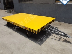 厂区平板车一般采用充气式实心轮胎,板面高度低、装载量大。无破胎、爆胎的危险。安全、简单而耐用。他自身无动力,需要又牵引车或者叉车来进行拖带。通常由一辆或多辆平板车和一台叉车或牵引车组成一列车辆来进行货物平面运输或大型设备的搬运工作。广泛应用于机场、港口、火车站、工厂和大型仓库。大大的提高了货物中转平移的效率。减少叉车和人力的消耗成本。